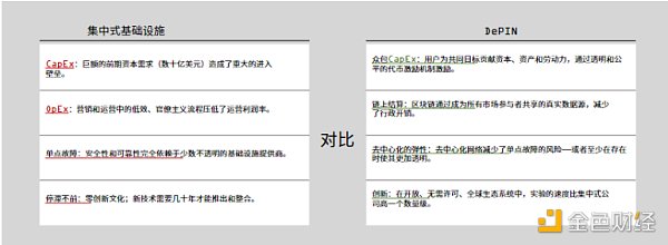 DePIN与传统中心化基础设置的对比如下所示