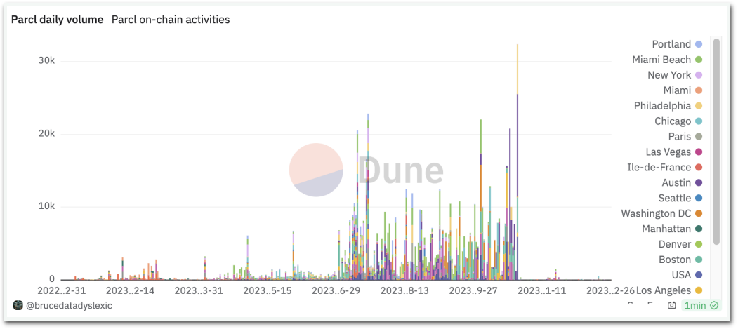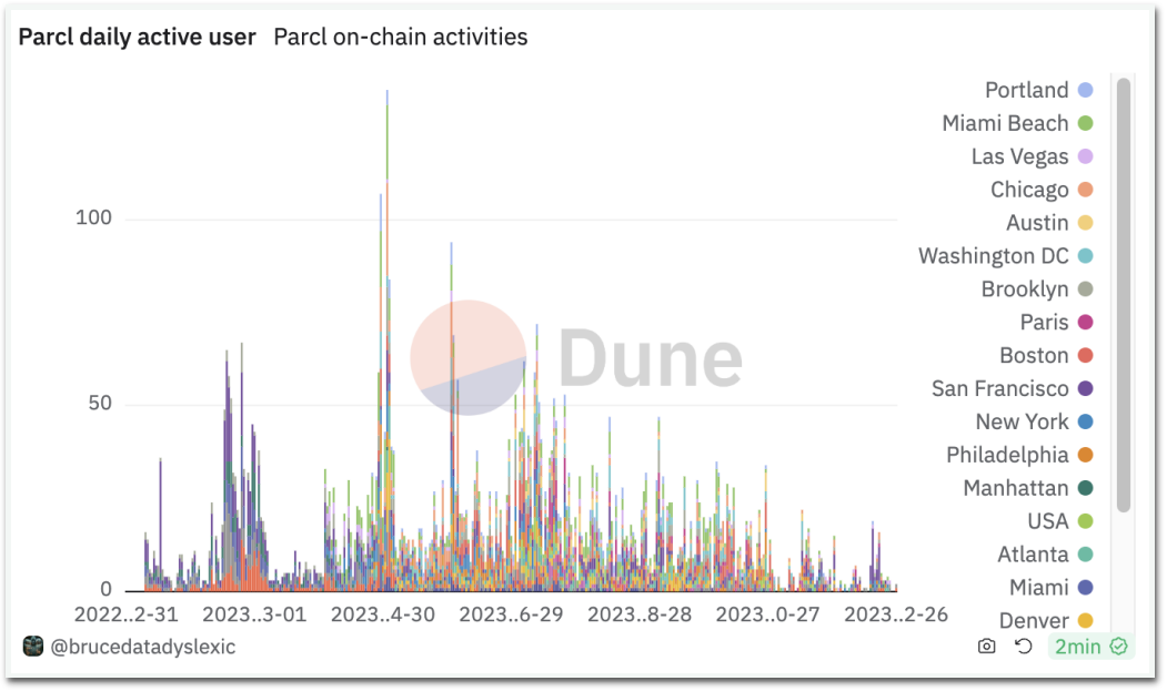Parcl的测试网在2022年5月在Solana上启动,目前其TVL有1600万美元。然而经过一年多的运营,Parcl似乎并没有引起太多关注,每日交易量不到10,000美元,每日活跃用户不到50人。