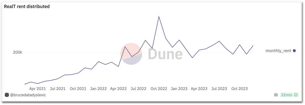 再根据RealT在其主要运营网络Gnosis的钱包地址上查询交易数据(钱包地址:0xE7D97868265078bd5022Bc2622C94dFc1Ef1D402),RealT总共大约分发了600万美元的租金。平台费用根据维护费用、保险和税费的波动,大约在租金的2.5%-3%之间,相当于过去两年来平台收入大约150K到180K美元。然而,由于RealT没有被强制要求参与房地产投资,且如果选择参与,其参与程度没有特定的限制或说明,因此RealT从租金收入中获得的利润不得而知。