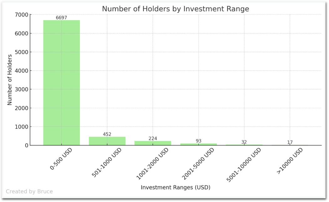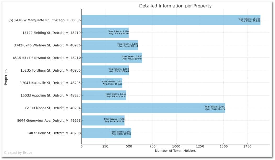 通过查看了RealT市场上最新售罄的十个房产代币,并使用相关的区块链浏览器来找出每个房产有多少持有者。正如你在图表中看到的,RealT将房产分散成不同数量的代币,以确保每个代币的价格在50美元左右。大多数房产位于底特律,并且大约有500个代币持有者,其中两个房产的持有者超过了1,000人。现在,结合每个持有者的代币数量来计算出RealT投资者的投资范围。