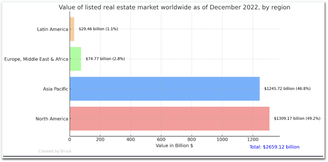 房地产市场是一个充满投资机会的庞大领域。2023年3月发布的Statista研究显示,北美上市房地产市场的价值达到了庞大的的1.3万亿美元。而全球上市房地产市场为2.66万亿美元。