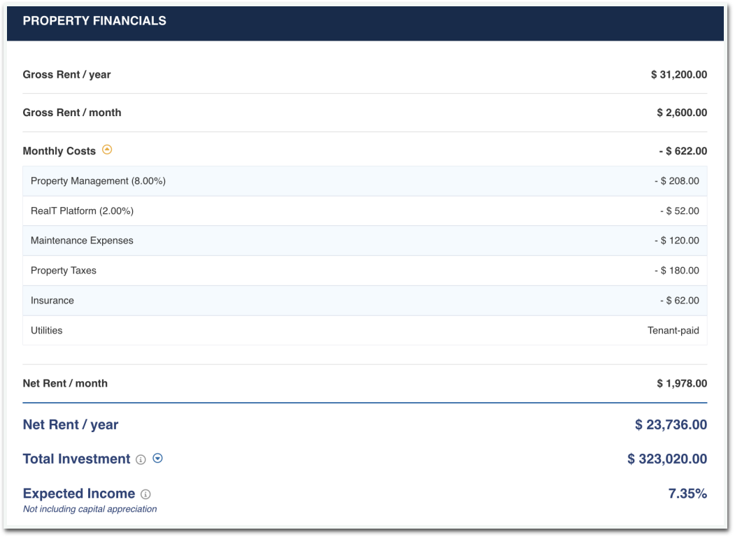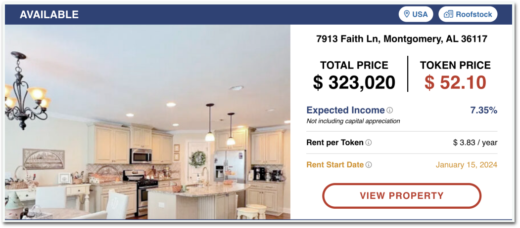 以蒙哥马利的这处房产为例,房地产代币的总价值为323,020美元,每个代币的价格为52.10美元,共发行了6,200个代币。该房产每月产生2,600美元的租金收入。扣除总计622美元的运营和管理费用后,每月净利润为1,978美元,年度总额为23,736美元。因此,每个代币获得3.83美元的分配,导致年利润率为7.35%。