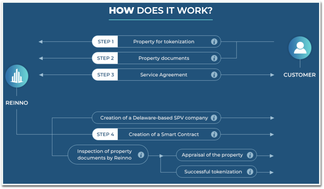 第一个产品是基于代币化房地产的贷款服务。当房产所有者需要融资时,他们可以将房产文件提交给Reinno。获得批准后,Reinno将在特拉华州为其创建一个特殊目的载体公司(也称为SPV,是由母公司创建的子公司,用来隔离财务风险。其作为独立公司的法律地位使其义务即使母公司破产也是安全的。在美国,SPV通常与LLC相同。)然后,Reinno将为房地产代币创建一个智能合约,所有者可以将代币作为贷款的抵押品存入并进行借贷,贷款限额将基于代币价值。