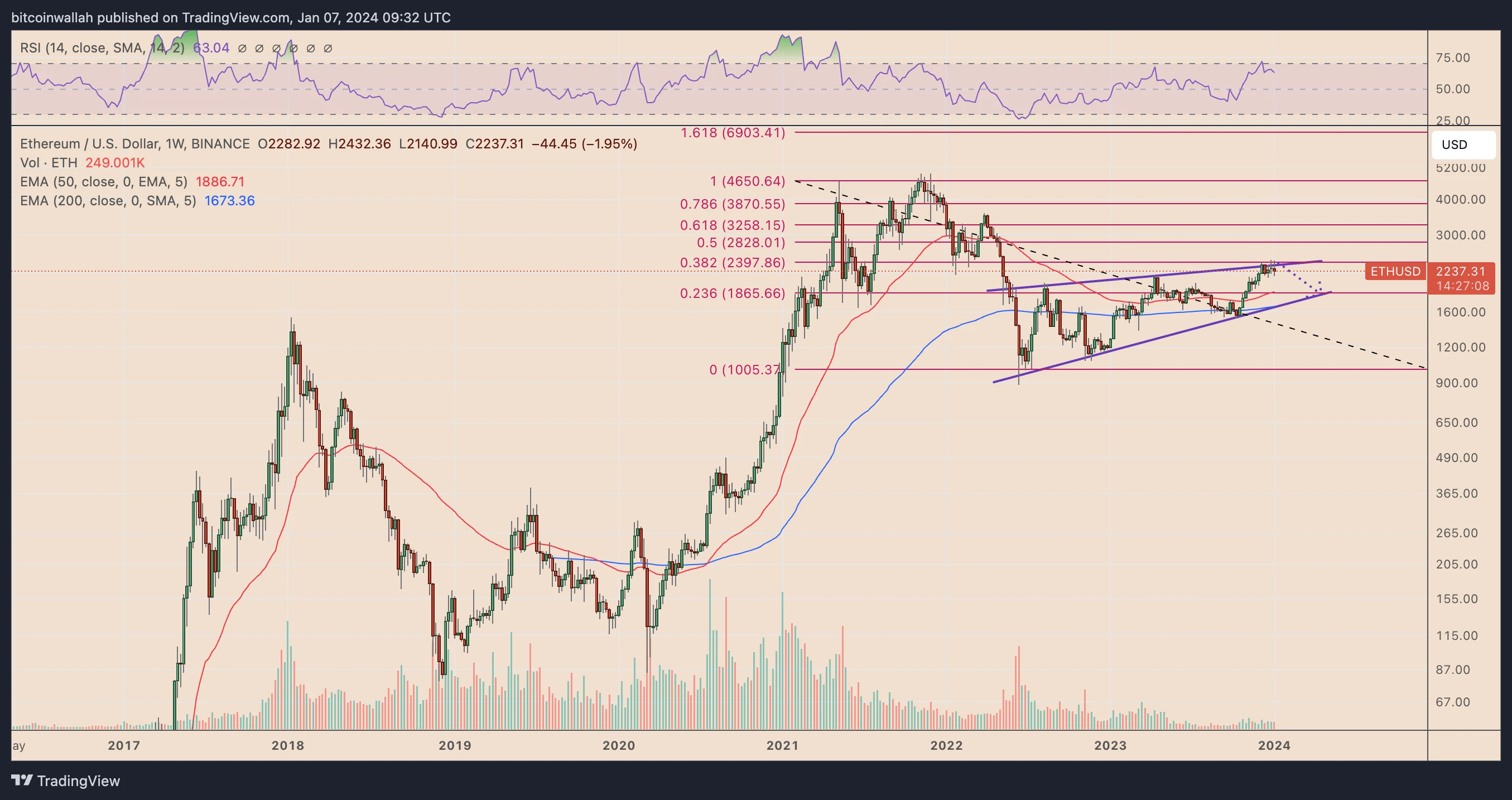 从 K 线技术指标来看,近日,ETH 的价格正接近其上升楔形形态的阻力趋势线。延迟或拒绝比特币 ETF 可能导致价格在 2 月份会回调至楔形下方趋势线 1865 美元附近。