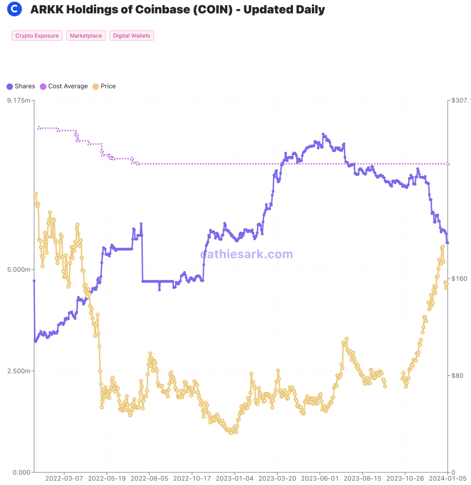 Catherine Wood 已经把 23 年加仓的 COIN 全卖了,不过考虑到价格涨太多,COIN 权重太高了,要被动减仓的成分不少,即便减仓了 32% 依旧是 ARK 系列基金里第一大持仓: