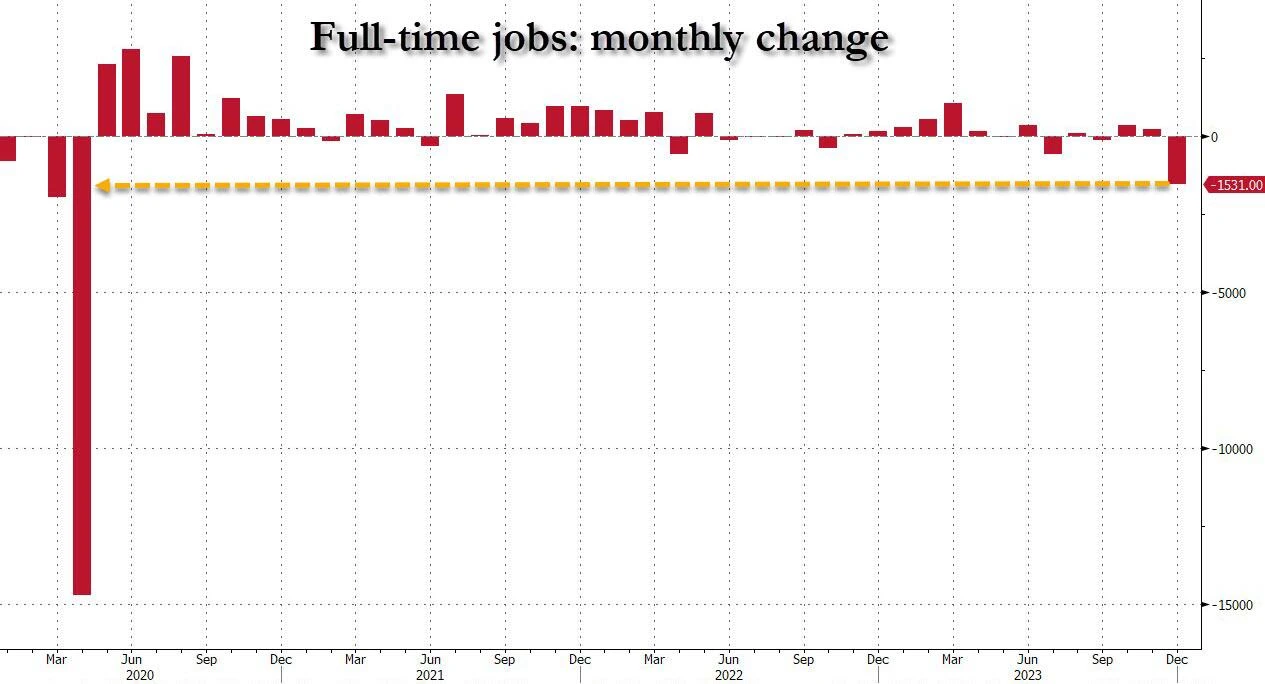 不过仔细看来 12 月全职工作岗位数量大幅下降减少 153.1 万至 1.332 亿,这是新冠疫情来全职岗位最大月度跌幅,当然,随着全职工作岗位的锐减,必须有一些东西来抵消这种下降,果然,这一切都在于兼职工人的激增。12 月,兼职人数猛增 76.2 万人,创下自新冠封锁以来的第二高月度增幅,达到 2779.4 万人,创 2018 年 3 月以来最高增幅,这暗示美国经济虚火较旺