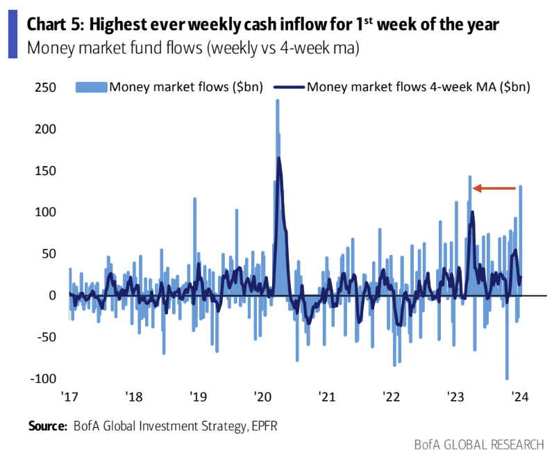 EPFR 数据显示,在截至 1 月 3 日的一周内,投资者向货币市场基金注入了 1230 亿美元,是自 2023 年 3 月以来最大单周流入。相比之下,股市和债券的资金流入分别仅有 76 亿美元和 106 亿美元。