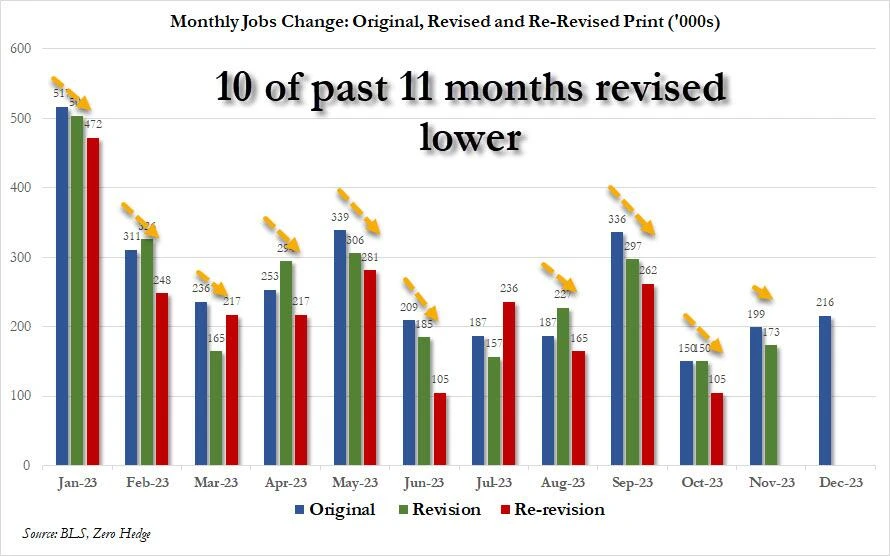 社媒上的舆论已经不太相信初值数字,如下图所示,过去 11 个月中有 10 个月的初值已被下调,评论认为白宫就可以将一个强劲的数字归功于自己,但在一两个月后,当没有人注意时,却悄悄地下调了该数字: