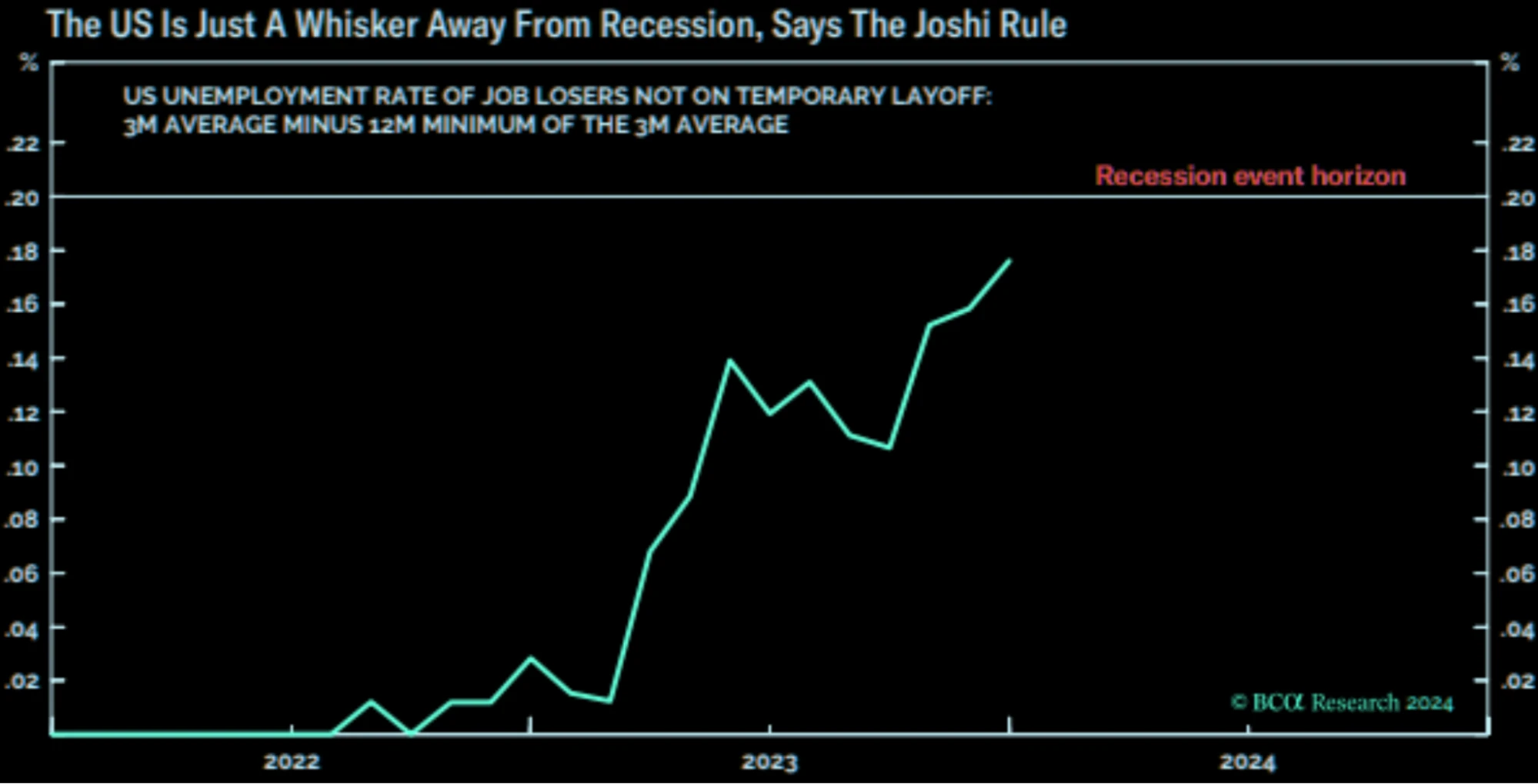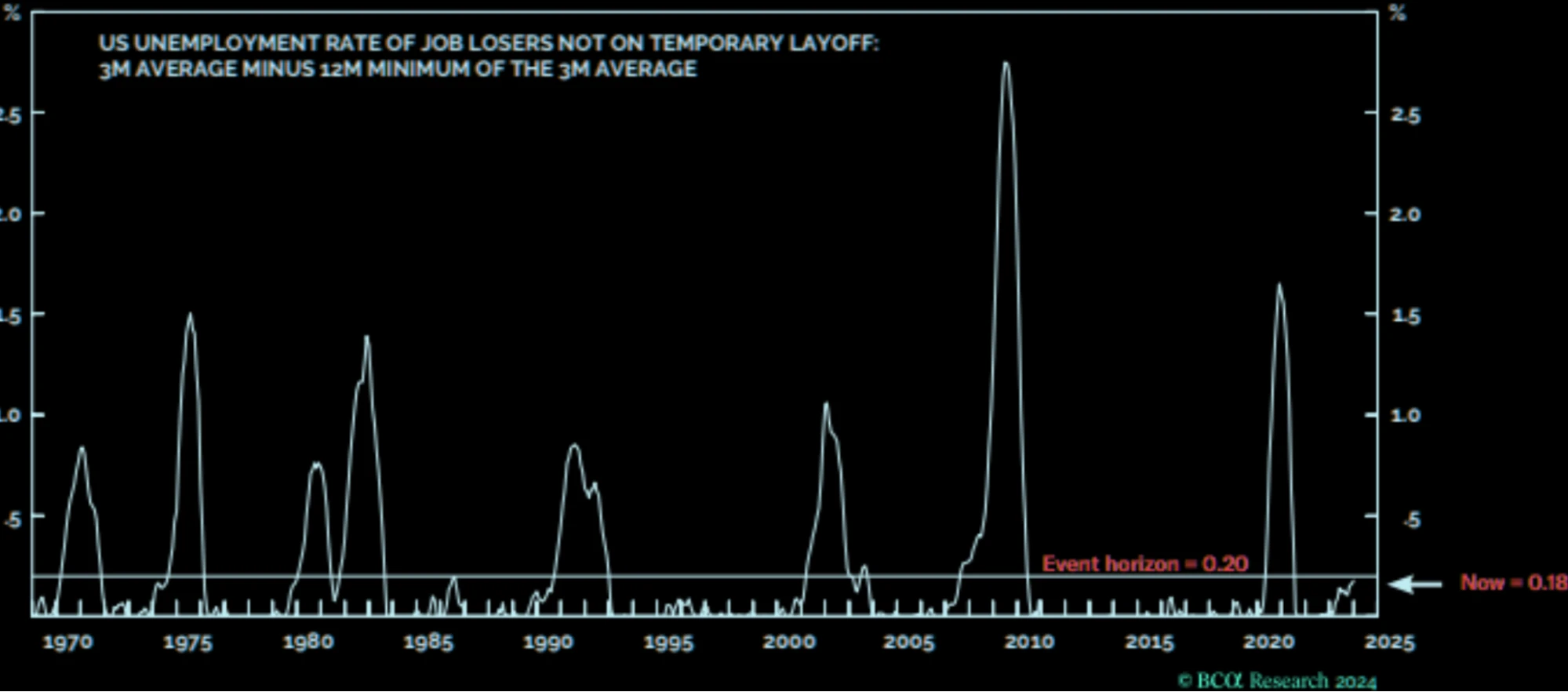 BCA Research 的衰退指标作为参考,指标用非临时工被裁员的数量的三个月移动平均值从过去 12 个月的低点上升 0.20% 作为进入衰退的的门槛,目前是 0.18%