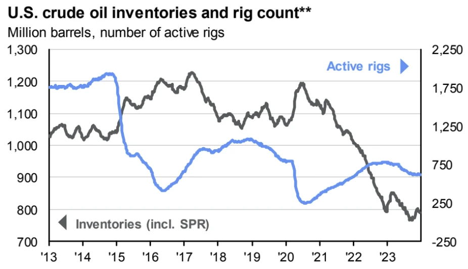 美国库存小幅补充后又掉头向下,钻井数量企稳: