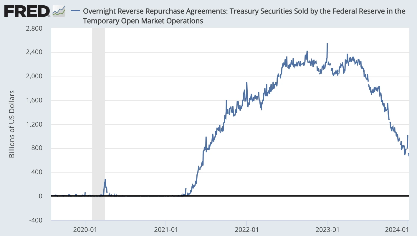 隔夜逆回购 ONRRP,作为非银机构闲置资金的蓄水池,当市场上流动性充裕时,货币基金会将现金存入隔夜逆回购市场,因此该账户的走势可以在很大程度上反映出市场的流动性现状。截止 2024 年 1 月 5 日,纽约联储隔夜逆回购规模已经从 2022 年末峰值的 2.55 万亿美元大幅收缩至 6944 亿美元,缩减幅度超过 70% ,反映出市场流动性已经大幅下降,这部分钱中大头应该去接盘了美债现货,然后就是流入货币基金,这部分资金规模接近“枯竭”的话可能会引发市场的恐慌(但任何事都有两面,这也会成为 Fed 转向的理由。不一定是降息,也有可能是减缓 QT)。