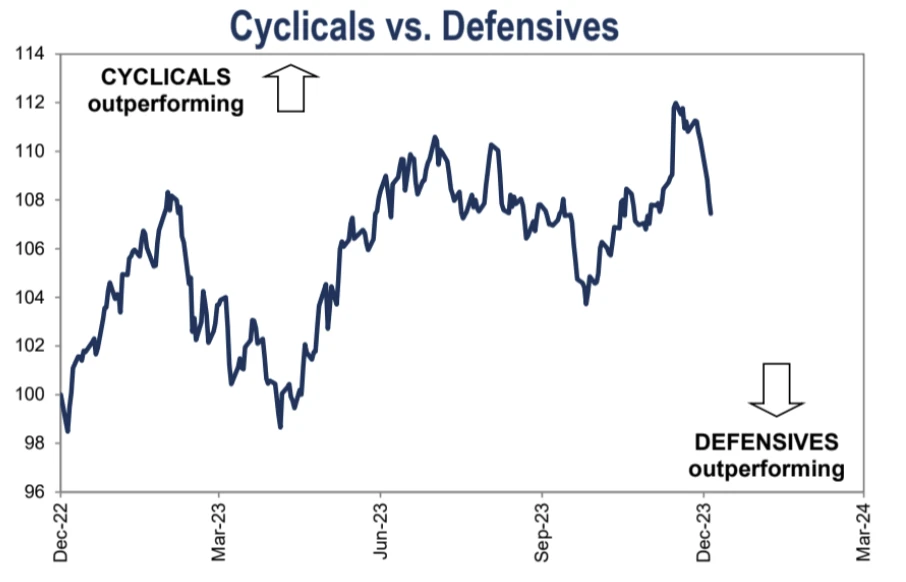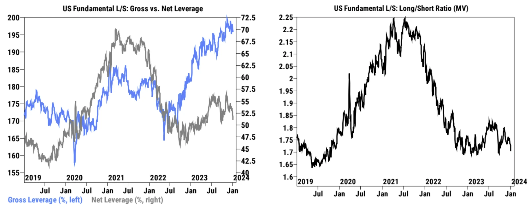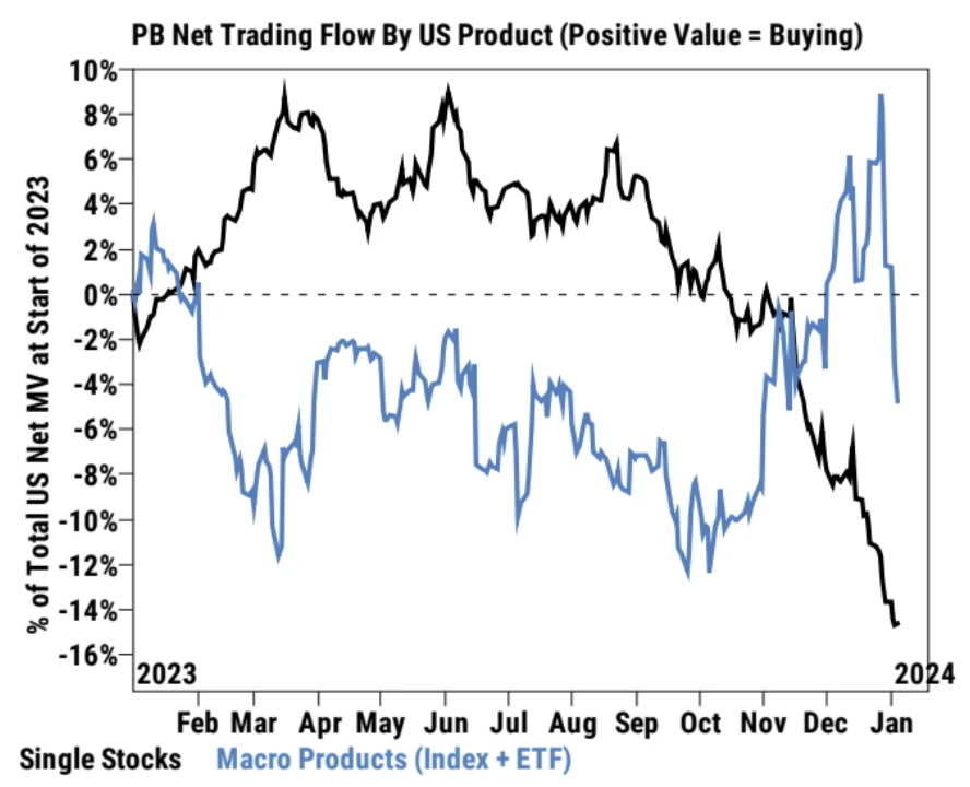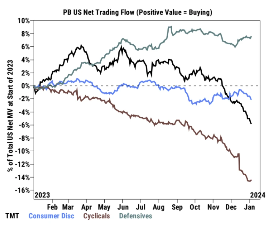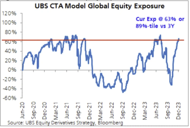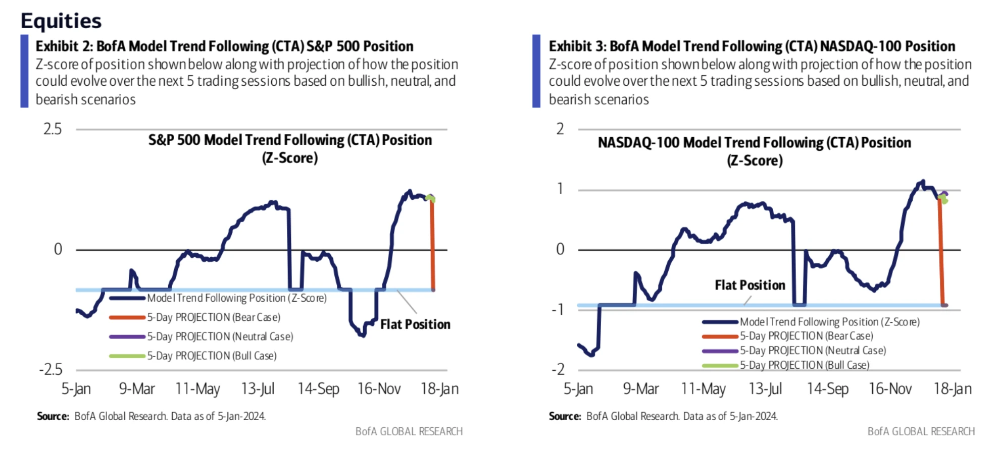 尽管市场开年市场回调了不少,但对 2024 年初的看跌观点仍然存在,预测标准普尔 500 指数还有至少 10% 的下行空间,纳斯达克跌幅更大,基于三个关键的技术信号: 12 月美联储会议后的宏观过度流动逆转、瑞银客户的卖盘行为以及空头挤压结束信号。其它利空还有公司回购窗口期接下来两周都处于低位,对市场支持有限,对冲基金仓位较高,为了避税的投资者把本该在 23 年兑现的盈利推迟到 24 年,从而资本利得税也推迟到 24 年;CTA 资金流的看跌不对称风险等等。