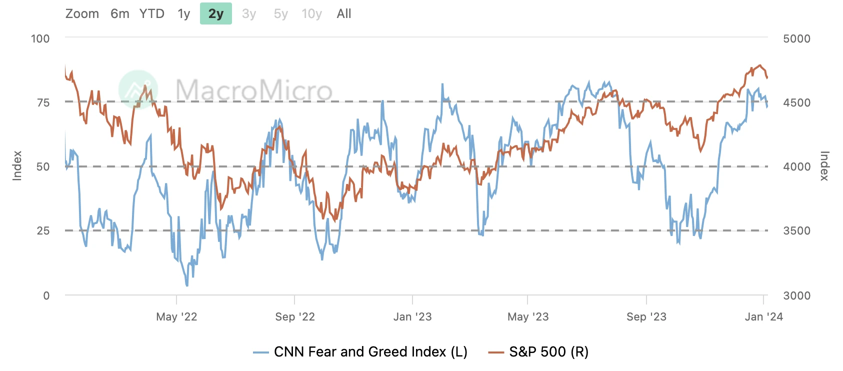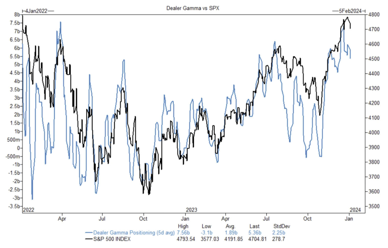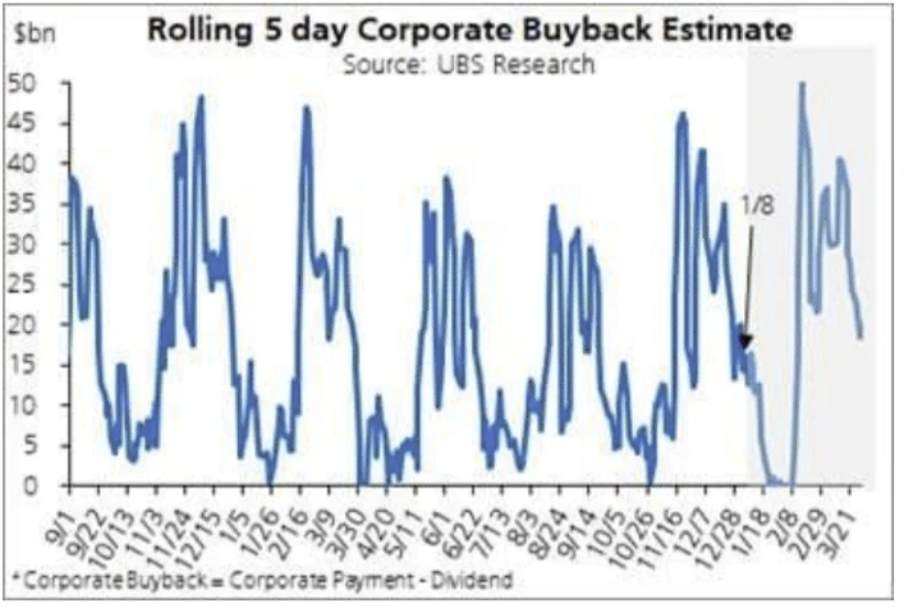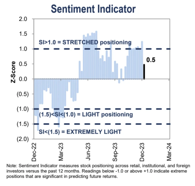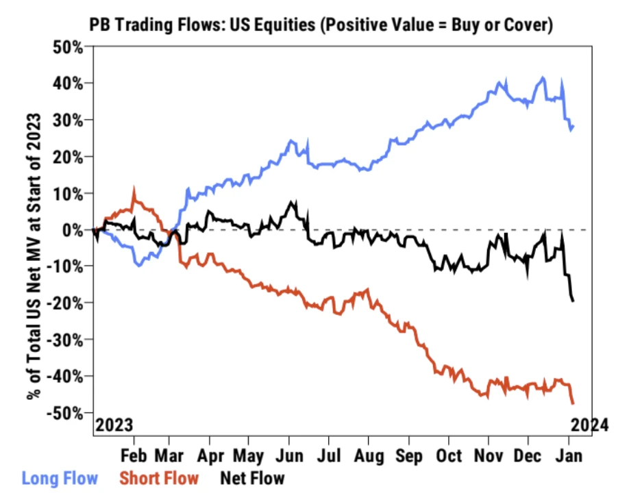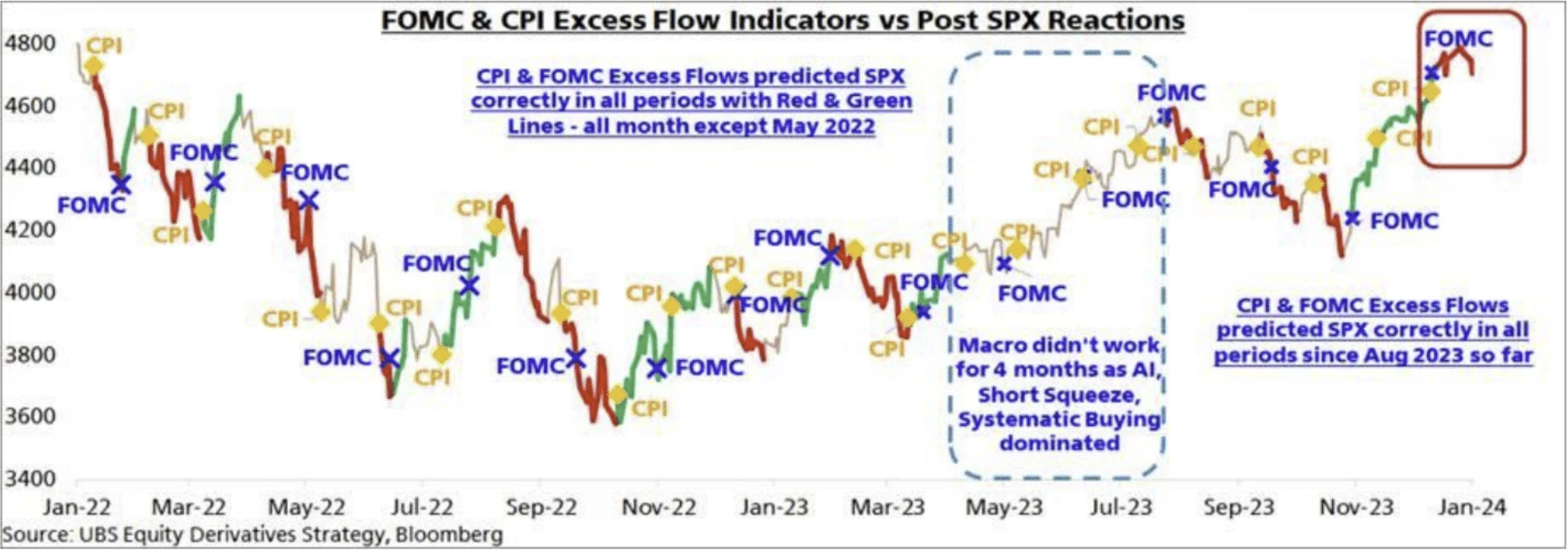 尽管市场开年市场回调了不少,但对 2024 年初的看跌观点仍然存在,预测标准普尔 500 指数还有至少 10% 的下行空间,纳斯达克跌幅更大,基于三个关键的技术信号: 12 月美联储会议后的宏观过度流动逆转、瑞银客户的卖盘行为以及空头挤压结束信号。其它利空还有公司回购窗口期接下来两周都处于低位,对市场支持有限,对冲基金仓位较高,为了避税的投资者把本该在 23 年兑现的盈利推迟到 24 年,从而资本利得税也推迟到 24 年;CTA 资金流的看跌不对称风险等等。