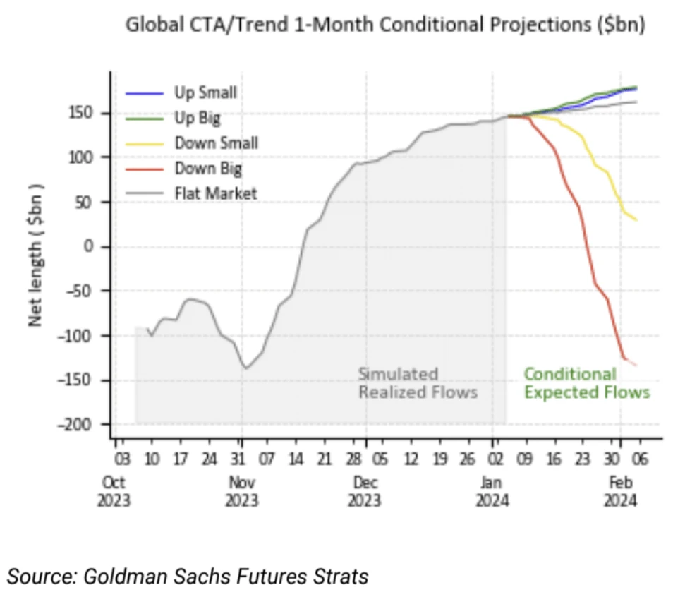 GS 的模型显示未来几周 CTA 资金倾向于在市场下跌时卖出,动力远大于上涨时买入: