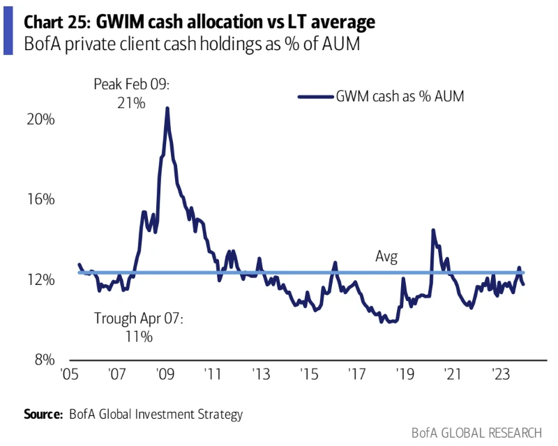 现金配置比例降至 11.8% , 07 年来均值为 11% :