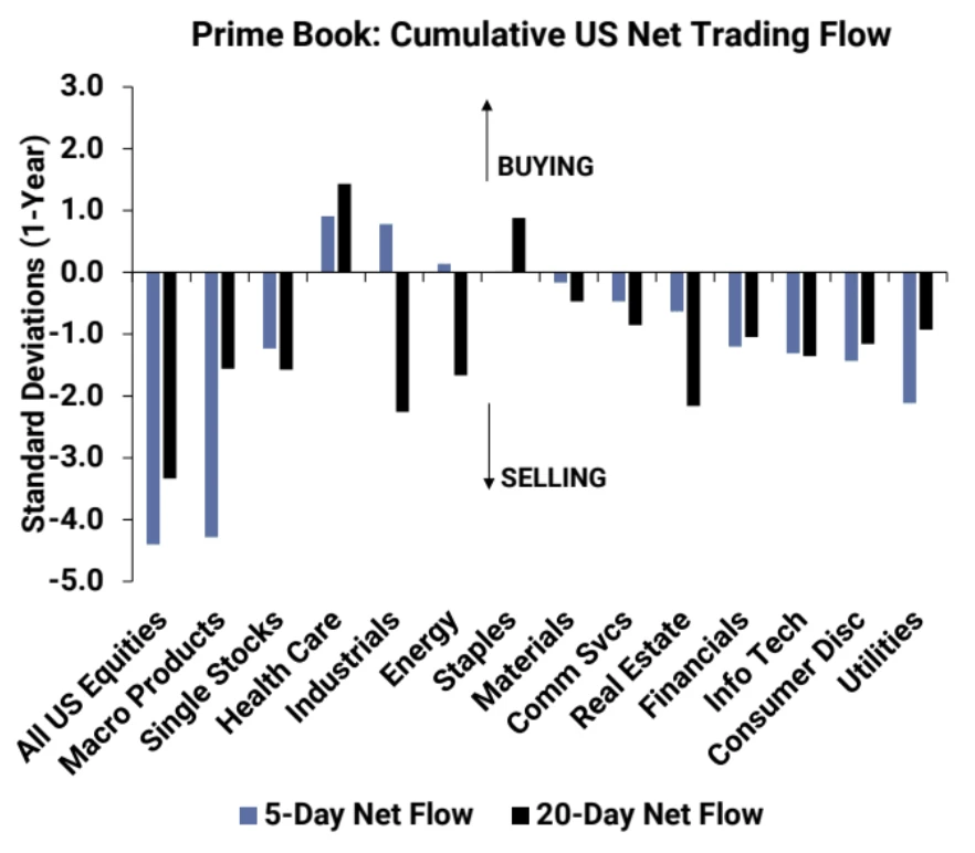 对冲基金在过去两周在快速削减风险敞口,主要以卖出宏观 ETF 产品为主,占了全部净卖出量的 85% :卖空量是买入量的 4 倍。信息技术、非必需消费、金融和公用事业板块净卖出最多。医疗保健,能源,工业净买入最多。