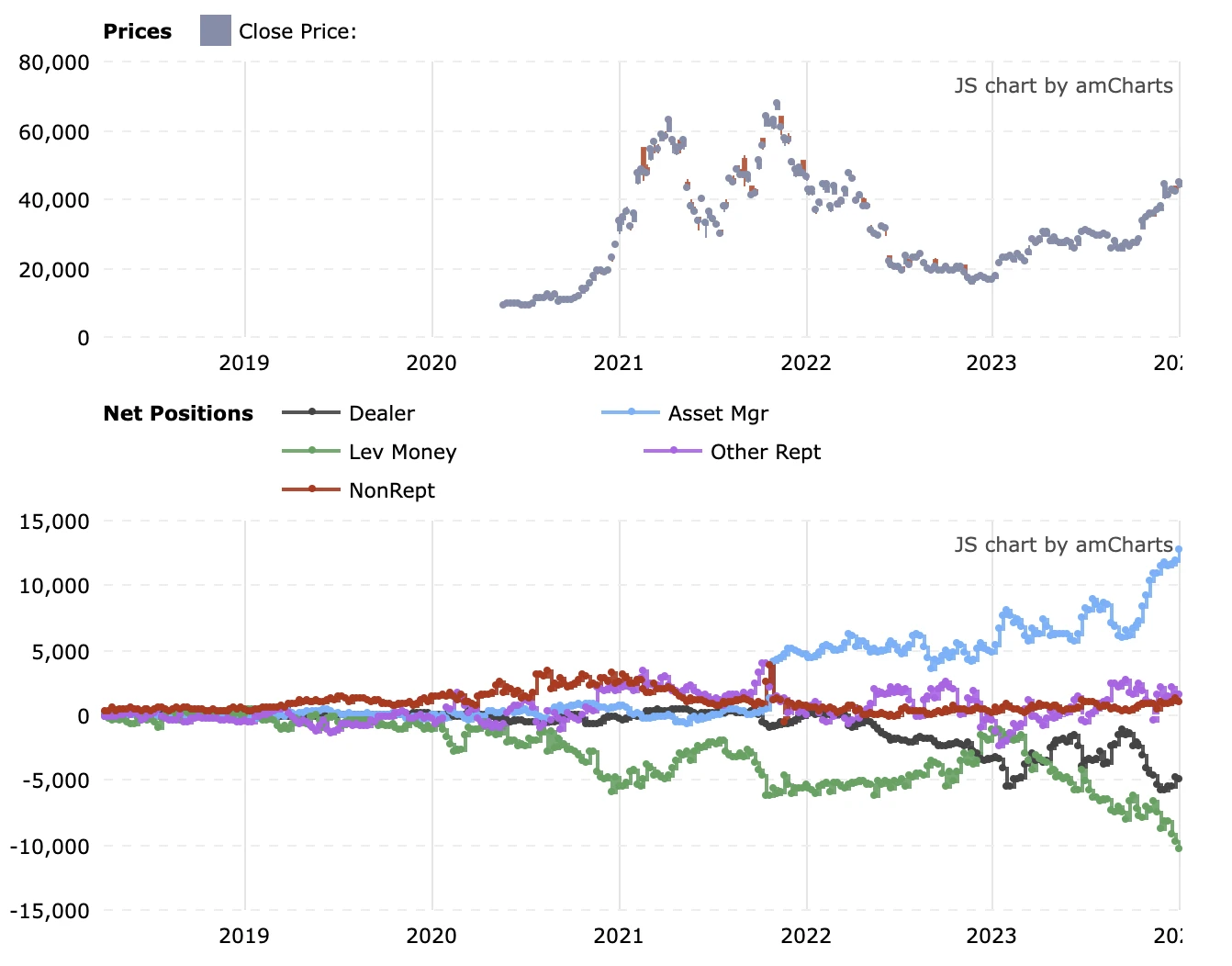 BTC 资管和杠杆基金的观点分歧更加明显,净头寸双双创历史新高,上次出现这种情况还是在 2021 年 10 月 BTC 冲顶 60000 前:
