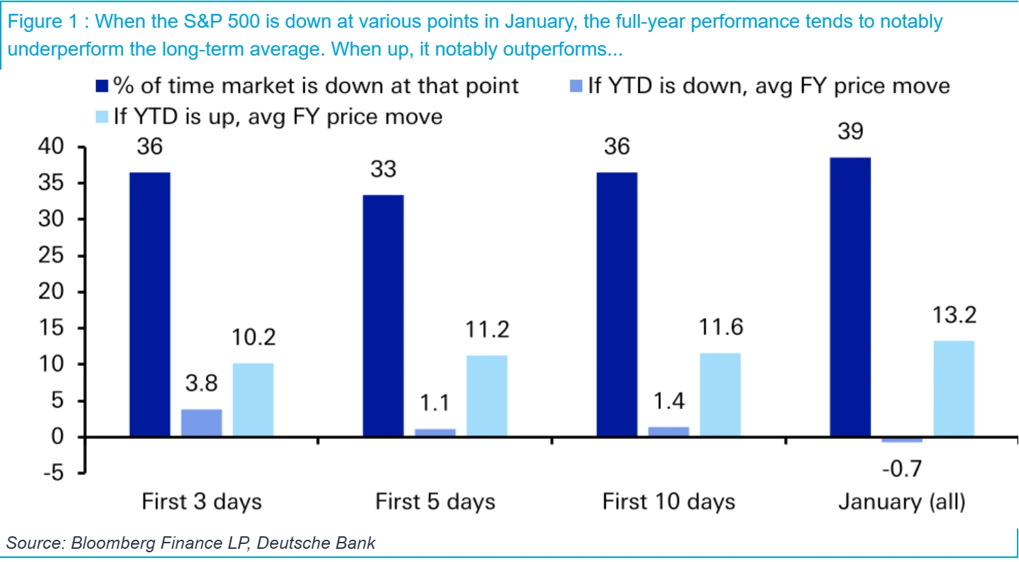 根据 DB 的统计凡是美股开年涨势偏弱的,全年走势也会弱于均值: