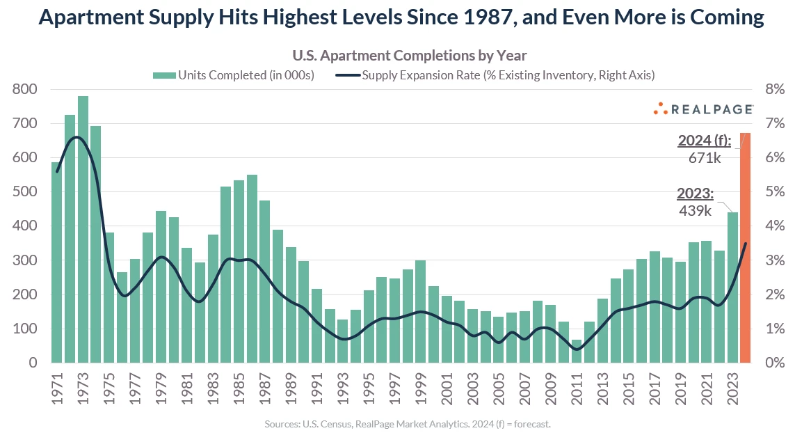 2023 年美国公寓供应量飙升至 1987 年以来的最高水平,竣工量超过 43.9 万套。2024 年还将竣工更多单元。这意味着租房者突然有了更多的选择,这会压制租金增长。