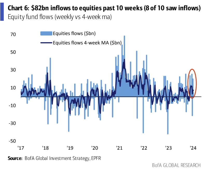 美银客户继续增持股票,使股票配置比重达到 6 个月新高的 60.2%