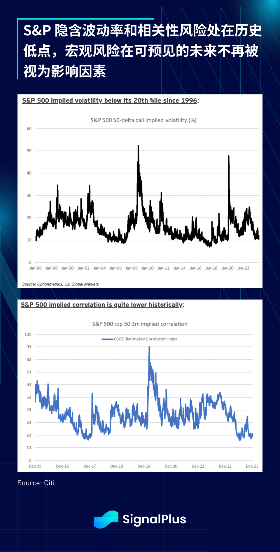 从风险溢价的角度来看,S&P 隐含波动率已回落至过去 30 年来的最低区间,隐含相关性也处于历史低点(自 2006 以来第 3 个百分位数),显示投资者当下对宏观风险感到非常放心和自满,短期内股市将会把焦点放在企业盈利表现。