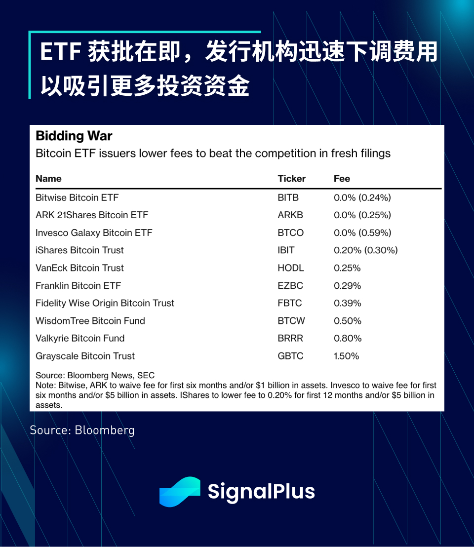 此外,BTC ETF 的费用战已经开打,许多发行机构将手续费降低到低至 0.25% ,比 Greyscale 1.5% 的手续费低上许多,我们预计 Greyscale 仍会是长期加密货币投资者的首选,不过由于其他机构手续费大幅降低,大多数新参与者将转向新发行机构,更不用说相比于现有加密货币投资架构的便利性。让我们热烈欢迎即将加入我们的 TradFi 朋友们(希望如此)!