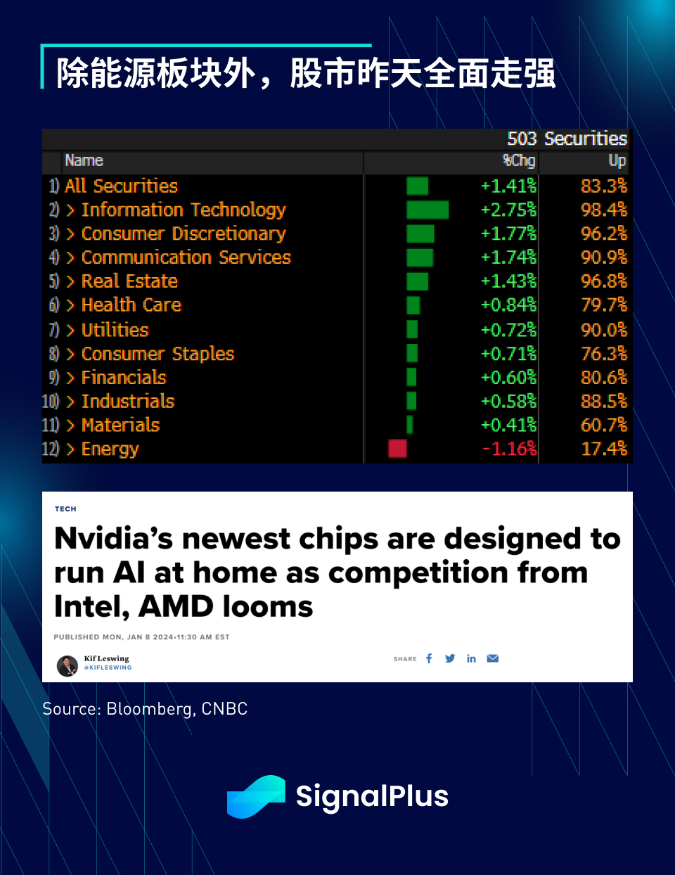 在股市方面,昨天各板块普遍上涨,大型科技股再次领涨, 83% 的成分股都呈现涨势,如果不是能源板块因油价下滑而走跌 1% ,昨天所有 S&P 板块都会呈现绿色。Nvidia 推出新型桌面电脑显卡,并宣布他们将为中国市场量身打造 H20 芯片,以符合美国最新的出口限制,受消息激励,昨天股价上涨超过 6% 。