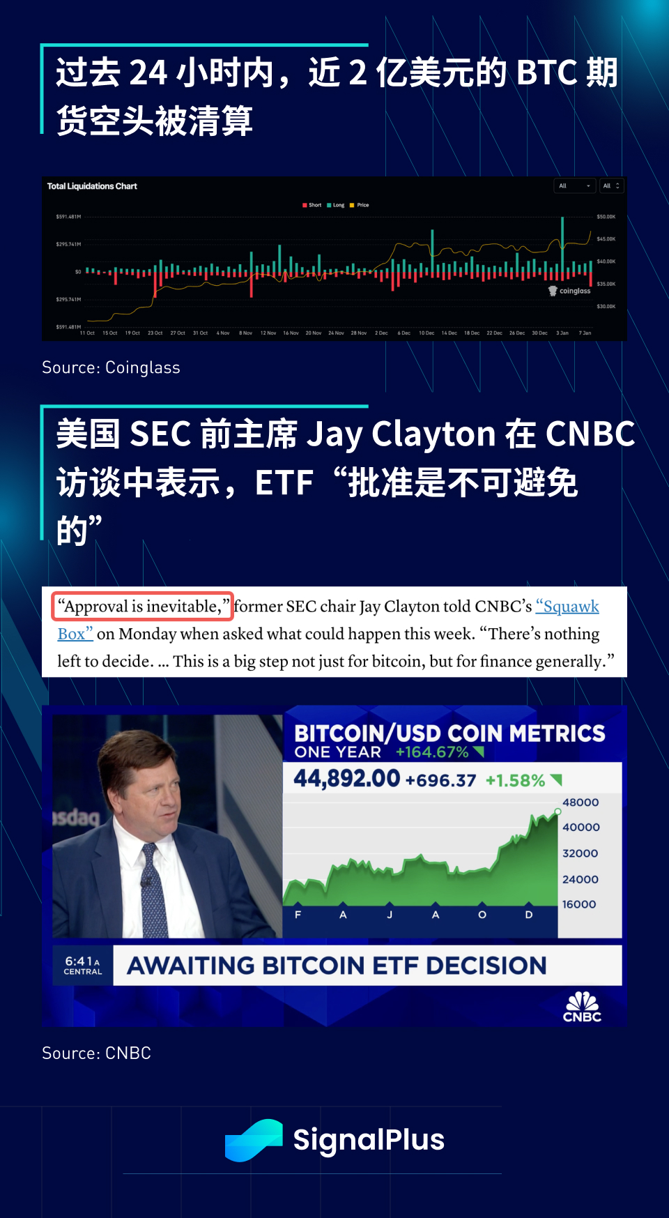 在加密货币方面,BTC 已从先前的抛售中反弹,价格接近 4.7 万美元,过去 24 小时内有近 2 亿美元的空头期货被清算,ETF 批准预期现已达到高潮,有报导称 ETF 申请机构已经提交了最后修订的 S-1 招股说明书,前 SEC 主席 Jay Clayton 昨天在 CNBC 的访谈中也表示“批准是无可避免的”。
