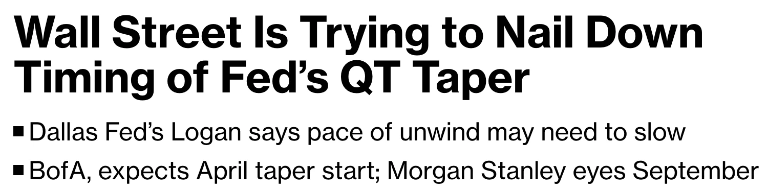 在经过第一周忙碌的价格调整后,市场昨天恢复了风险偏好基调,很大一部分是由于达拉斯联储 Logan 暗示美联储将放慢量化紧缩的步伐,在谈到通过降低 RRP 使用量(即共同基金存放多余资金的地方)来减少过剩流动性时,Logan 表示,“在我看来,随著隔夜 RRP 余额接近低水平,我们应该放慢缩减的速度”,并补充说“从长远来看,放缓调整资产负债表的步伐实际上有助于实现更有效的资产负债表,因为这可以使再分配更加平滑,并降低我们不得不提前停止的可能性”。
