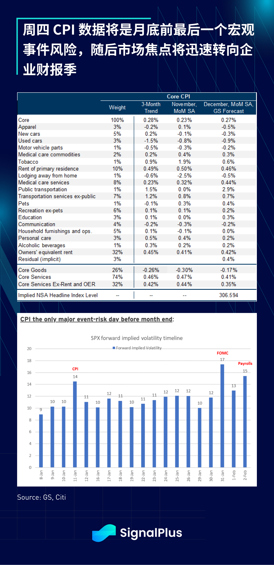 CPI 数据将于周四公布,市场预期核心 CPI 环比/同比将分别为 0.3% /3.8% ,整体 CPI 环比/同比预期为 0.2% /3.3% ,预计涨幅将由食品和能源价格推动,而住房价格将再次贡献大部分的基数增长;CPI 将是月底前最后一个宏观事件风险,随后市场焦点将转向企业盈利,直到 31 号的 FOMC 会议。
