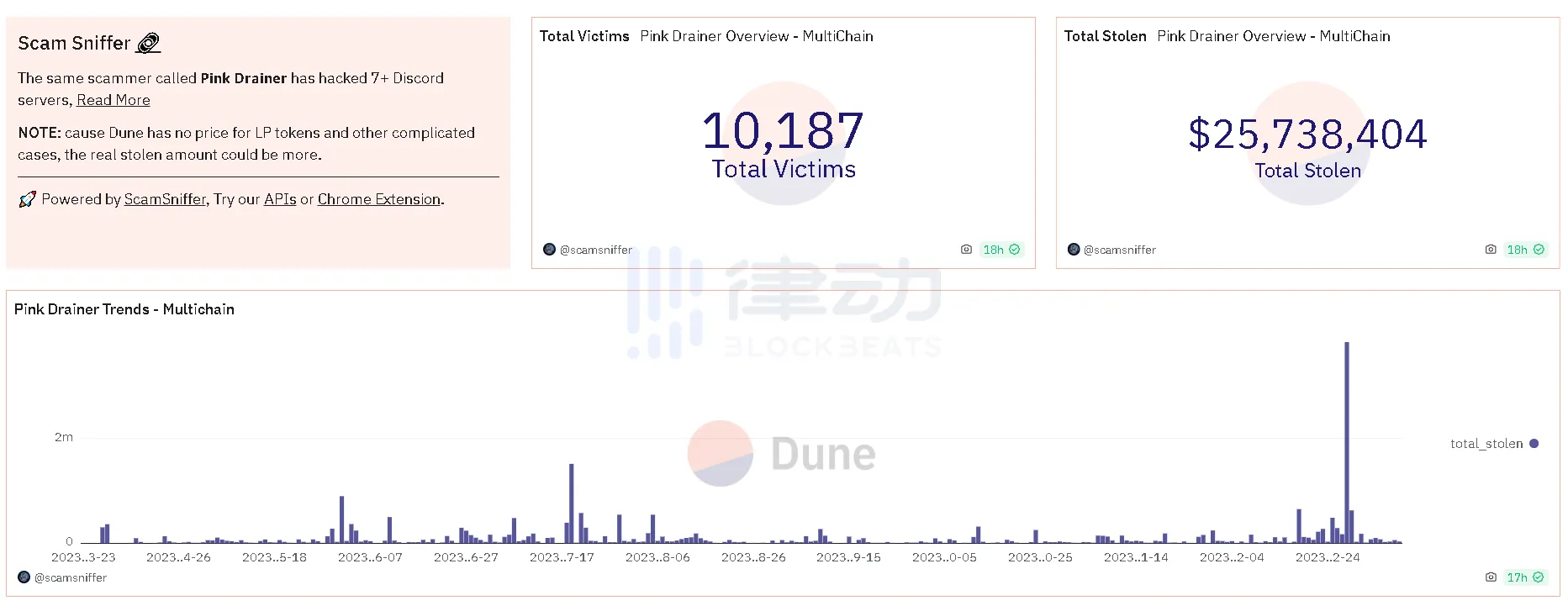 如今,Pink Drainer 的活动仍在呈上升趋势,据 Dune 数据显示,截至撰稿时,Pinkdrainer 已累计诈骗超过 2500 万美元,总受害者达上万人。