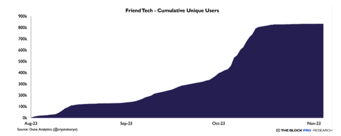 friend.tech 8 月份在 Coinbase 新的 Optimistic Rollup 解决方案 Base 上推出时,去中心化风靡一时,推出以来不到三个月,它就吸引了社区的关注,平台上拥有超过 900,000 名独立用户,交易量达到 4.75 亿美元。