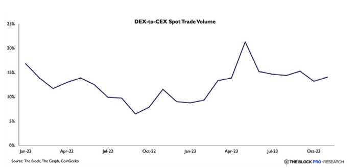 2023 年去中心化交易所也迎来爆发,原因之一是 FTX 倒闭后,许多人对中心化机构的信任下降,5 月由于memecoin 狂热推动,DEX 交易量与 CEX 交易量之比确实达 21% 以上的峰值。