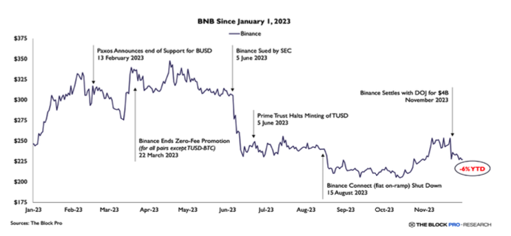 2023 年春天,加密货币交易所市场发生了另一个重要变化,为加密货币行业提供大量服务的几家美国地区银行破产,以及 2022 年多家加密货币贷款机构和交易所倒闭,美国的监管机构加强了审查,导致多家加密货币交易所受到指控,币安显然是监管机构关注的焦点。