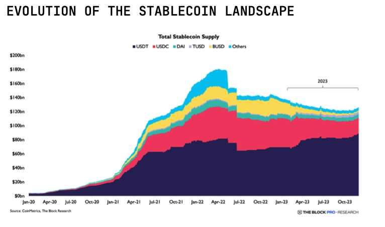 与此同时,稳定币市场也因利率上升和监管审查加强而发生了重大变化。在整个 2023 年,几种成熟的稳定币经历了去伪存真事件,侵蚀了它们的市场份额,而其他稳定币则在监管压力下被淘汰。Tether 是这些变化的主要受益者,其市场份额在 2023 年增长到了 2020 年以来从未见过的水平,而在 2020 年,市场竞争远没有现在这么激烈。与此同时,新进入者涌入市场,他们被国债收益率上升带来的更有利可图的商业模式所吸引。许多企业和中央银行也分别制定了稳定币和中央银行数字货币(CBDC)计划。