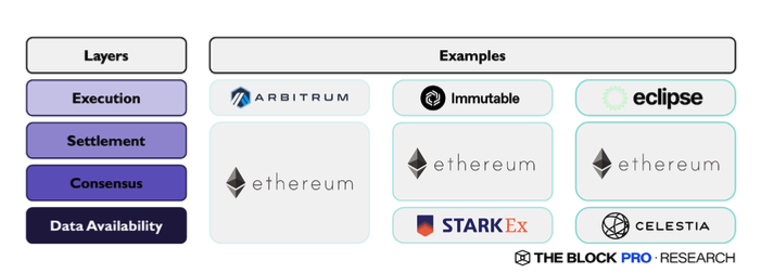 从 SOL(Solana)和 TIA(Celestia)的价格表现可以看出,市场对这两条链的关注,它们代表了集成与模块化争论的对立面,在 2023 年表现较好,Solana 的市值在 2023 年前 11 个月增长了约 430%,TIA 代币在 11 月初推出后的一个月内上涨了约 167%。