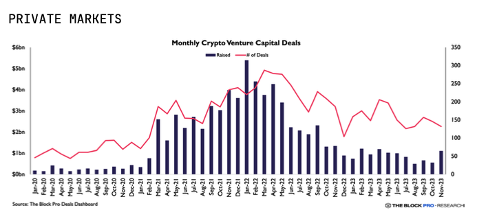 2023 年加密货币价格显著回升,总市值翻了一番,本轮价格复苏受到宏观经济因素和 FTX 破产事件去杠杆化结束的影响,除第四季度末外,投资者在加密领域的活动量较往年有所减少,交易量和风险投资交易达到多年低点。