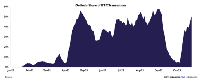 整个 2023 年,由于铭文的日益普及,比特币生态系统经历了重大转变。 自今年年初以来,矿工累计产生的总费用超过 5.3 亿美元,其中 9000 万美元来自 Ordinal 相关活动。 这些铭文导致比特币内存池的费用增加和拥塞,因为等待确认的交易总大小(以字节为单位)处于最高水平。目前,与铭文相关的交易占比特币网络日常交易的比例为 49%。 尽管此后这种主导地位较今年早些时候的水平略有下降,但它强调了 Ordinals对比特币区块空间经济的影响,特别是在区块奖励继续减少的情况下,交易格局的这种变化迫使矿工调整策略,以应对区块奖励和交易费用动态的变化。