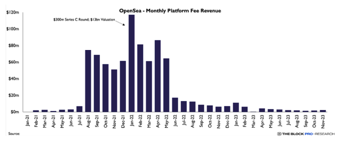 2023 年,NFT 市场发生了关键性转变,在 Blur 等新兴平台的推动下曾是主要收入来源的高平台费模式消失,OpenSea 在2022 年初年化收入超过 10 亿美元,到了 2023 年年中,其平台收入锐减至每月不足 200 万美元,下降了近 90%。