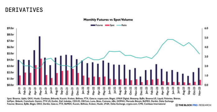 衍生品交易趋势与现货基本相似,今年期货合约的总成交量在 3 月见顶,9 月触及低点,尽管期货方面的成交量始终保持在高于 2022 年 12 月低点的水平。5 月和 6 月的期货交易量都达到了现货交易量的 4.7 倍。该比率在今年下半年开始略有下降,但与前两年相比仍然较高。