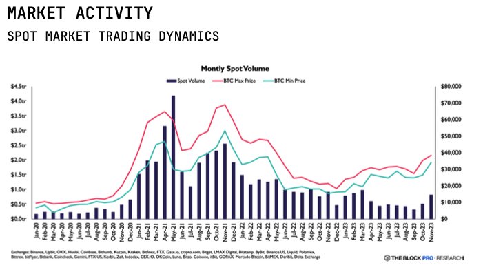 2023 年加密资产的市场活动受到多家贷款机构的破产影响而持续减少,但随着价格上涨和投资者信心的增强,交易量又开始增加。现货交易量在第一季度,1 月、2 月和 3 月的现货交易量都出现了逐月上升,但第二季度和第三季度的交易量大幅下降,第四季度交易量一直在持续上升,在 11 月份达到了 6 个月来的最高点。2023 年交易量低迷的一大原因是全球最大的加密货币交易所币安的收费机制调整,具体来说,3月币安结束了零手续费促销活动,该活动在 2022 年推动了平台上的交易量上涨,3 月至 4 月间,整体现货交易量下降了 38%,而币安的现货交易量同期减少了 47%。