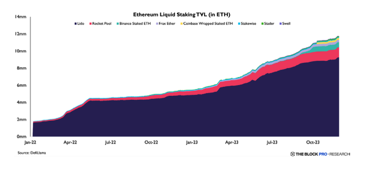 2023 年,以太坊流动性质押行业将成为 DeFi 领域的佼佼者,展现出非凡的韧性,这一卓越表现可归因于两个关键因素。首先,在以波动性低迷和借贷兴趣减弱为特征的熊市中,与其他 DeFi 活动相比,流动性质押产生的稳定收益相对更具吸引力。其次,流动性质押协议的普及提高了代币的效用。Lido保持了其在以太坊流动性质押领域的主导地位,占据了 78% 的市场份额,而 Rocket Pool 以 10% 的份额位居第二。