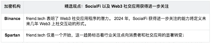 加密交易所 Binance 在报告中指出, friend.tech 引起的关注,尤其是来自加密货币领域之外的 influencer 的关注,表明了 Web3 社交应用程序的潜力。 2024 年,SocialFi 获得进一步关注的能力将定义未来几年 Web3 上社交互动的形式。加密机构 Spartan 同样也从 friend.tech 的爆发谈起,加上可能在来年发生的空投,已经引发了模仿项目的激增,「这只是一个开始,这一趋势标志着行业关注点向消费者和社交应用的显著转变」。