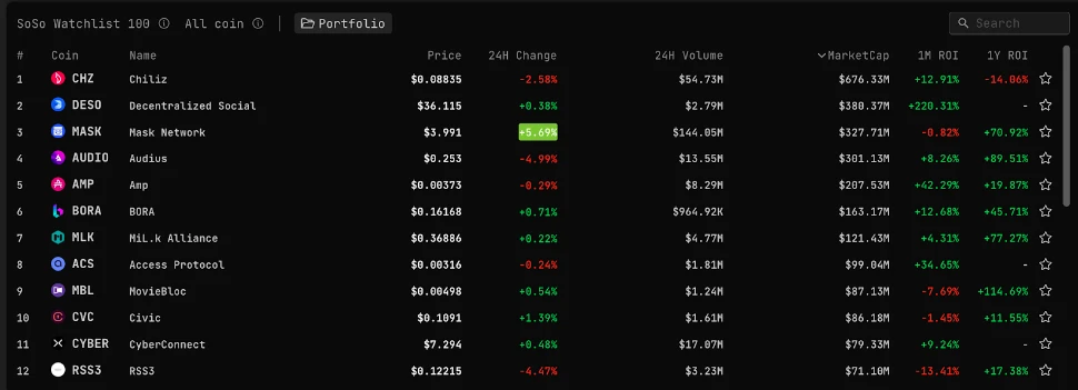 (SocialFi 领域部分代币一览|数据来自:https://alpha.sosovalue.xyz/)