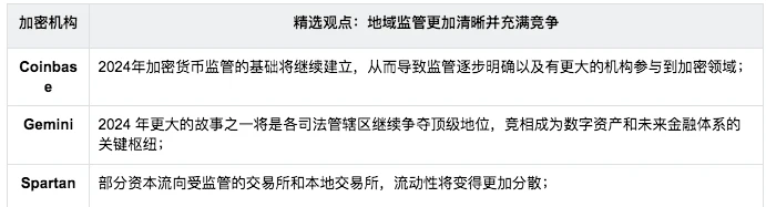 不止是监管的基础确立,同时全球的监管领域也将充满竞争,加密交易所 Gemini 在报告中表示,「 2024 年更大的故事之一将是各司法管辖区继续争夺顶级地位,竞相成为数字资产和未来金融体系的关键枢纽」。包括英国、欧盟、阿联酋、日本、香港、新加坡等国家看到了这一点并将正在持续竞争,旨在以拥有最可信的监管框架来吸引商业增长和创新。 ;