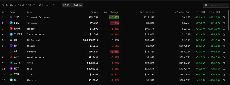 (DePIN 领域部分代币一览|数据来自:https://alpha.sosovalue.xyz/)