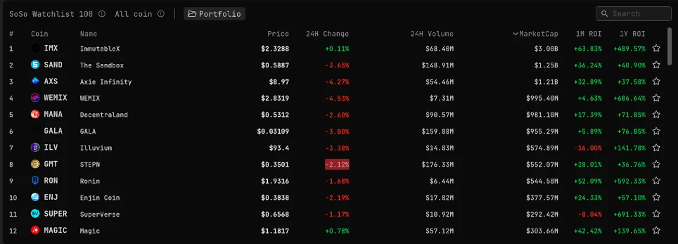 (GameFi 领域部分代币一览|数据来自:https://alpha.sosovalue.xyz/)