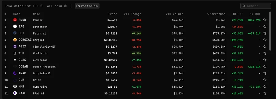 (AI 领域部分代币一览|数据来自:https://alpha.sosovalue.xyz/)