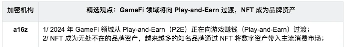 总体论调:关于 GameFi 领域,a16z 的叙事预测最值得关注,该机构表示 2024 年 GameFi 领域从 Play-and-Earn(P2E)正在向游戏赚钱(Play-and-Earn)过渡,同时 NFT 成为品牌资产,越来越多的知名品牌通过 NFT 将数字资产带入主流消费市场。