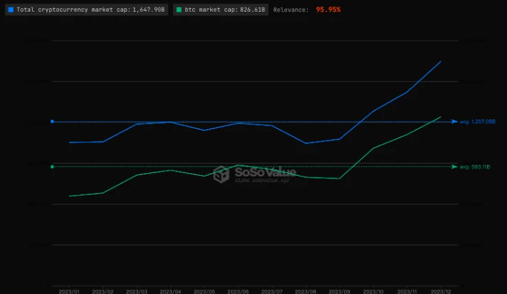 (Crypto 总市值和比特币市值对比|数据来自:https://alpha.sosovalue.xyz/)